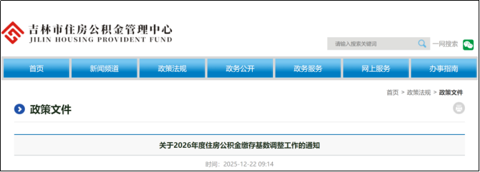 12月22日,吉林市住房公积金管理中心发布《关于2026年度住房公积金缴存基数调整工作的通知》,明确自2026年1月1日起,统一按新核定的缴存基数执行缴存。