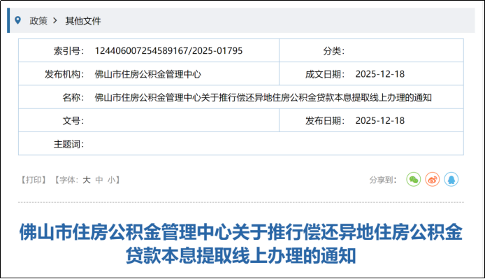 12月18日,佛山市住房公积金管理中心发布《关于推行偿还异地住房公积金贷款本息提取线上办理的通知》。在佛山缴存住房公积金的职工,想提取账户内公积金偿还异地公积金贷款,无需再跑线下窗口,线上即可轻松办理!