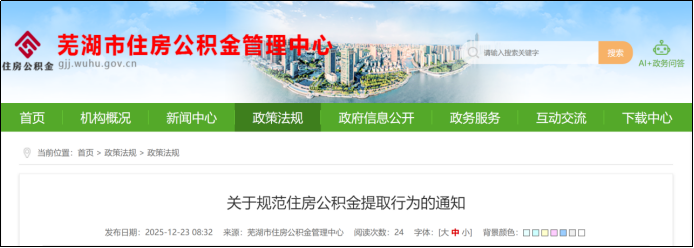 12月23日,芜湖市住房公积金管理中心发布《关于规范住房公积金提取行为的通知》。该通知自2025年12月23日起施行,有效期5年。